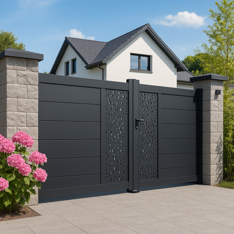 Portail en aluminium droit avec panneaux décoratif perforés au laser. Avec des lames de 200 mm sur la partie pleine et une traverse horizontale pour solidifier le portail mais aussi accueillir une motorisation.